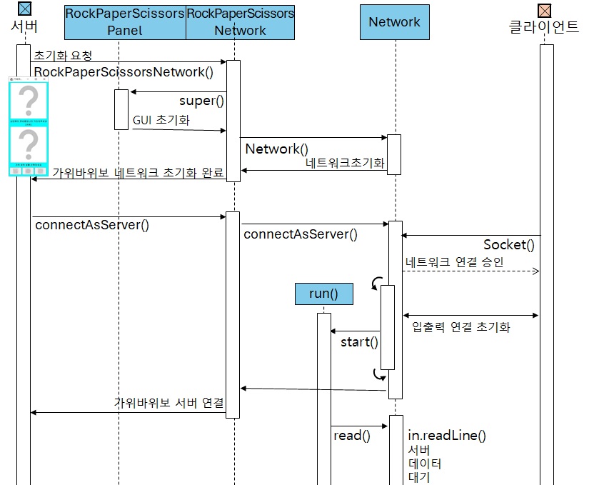 단일 클라이언트용 가위바위보 프로그램에서 네트워크 서버 부분의 문제입니다 이를 해결하는 프로그램의 다음 실행상태에 대해 빈칸을 채우세요